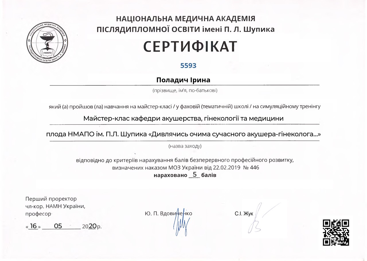 - 2020 - ТУ «Основи надання акушерсько-гінекологічної допомоги»;
